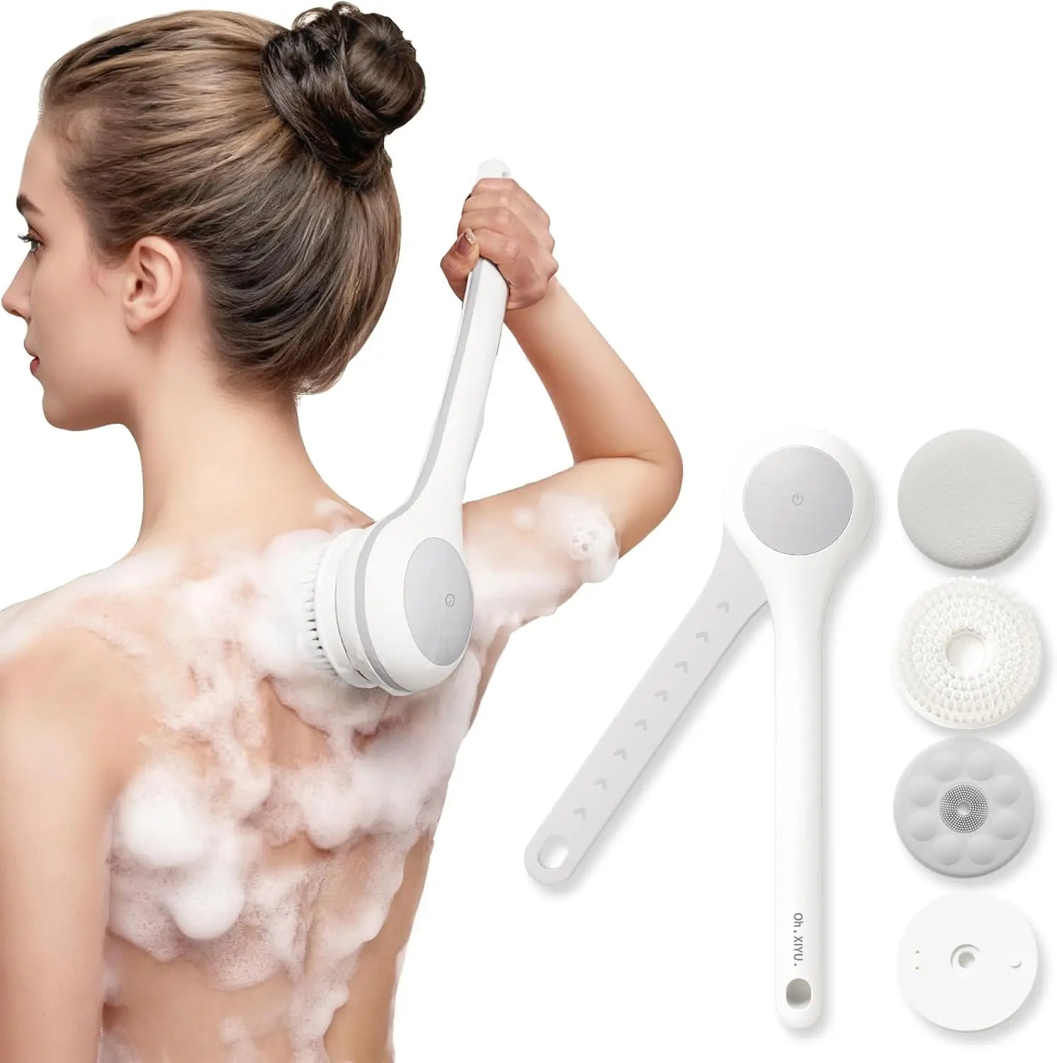Unique Dual-Handle Design: This electric body brush is designed with user-friendly double-length handle. The secondary handle is made of bendable silicone, can easily reach and clean your back and other body parts, pampering every inch of your skin, upgrading your bathing experience