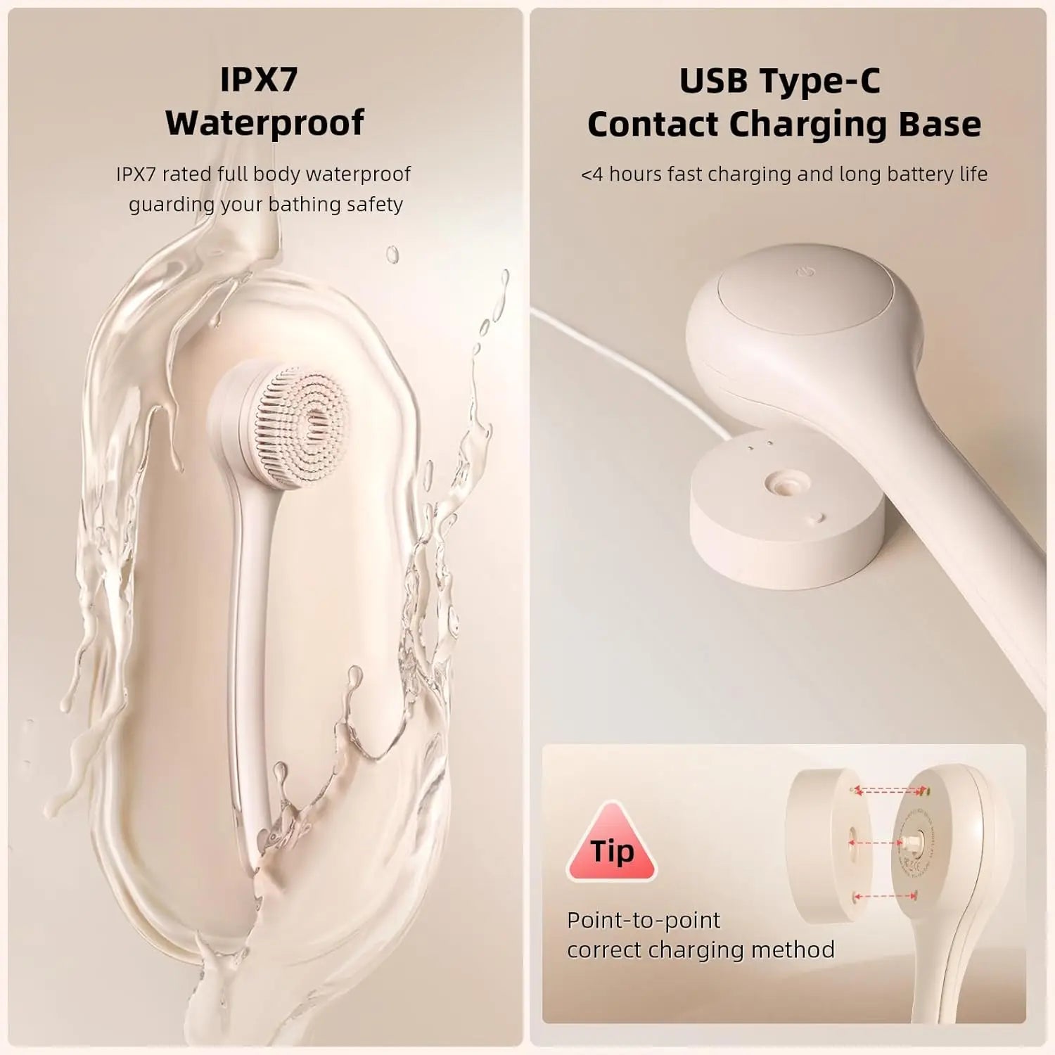Waterproof & Rechargeable: IPX7 rated full body waterproof, guarding the safety of bathing. Not only soaking, but also defending against normal hot water vapor. Ultra-long battery life, can last 30-60 days, built-in 2000 mAh battery. USB (Type-C) contact base charging, <4 hours to full, safer than plugging and more efficient than induction
