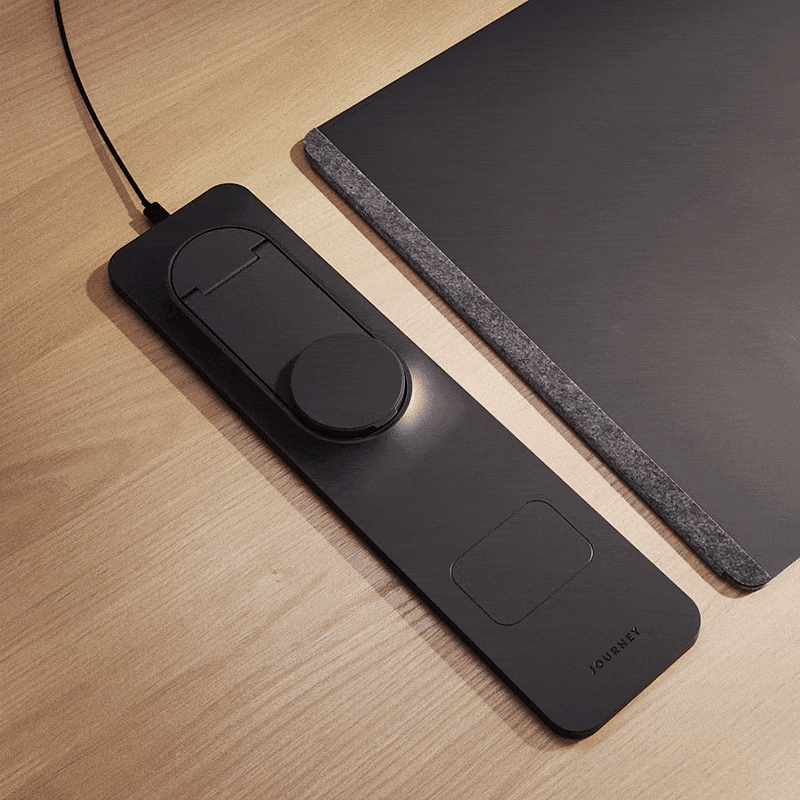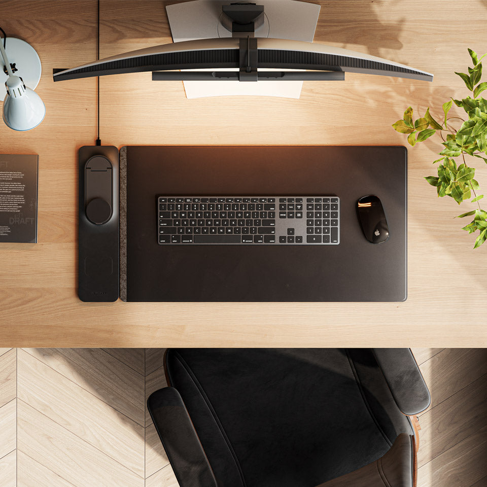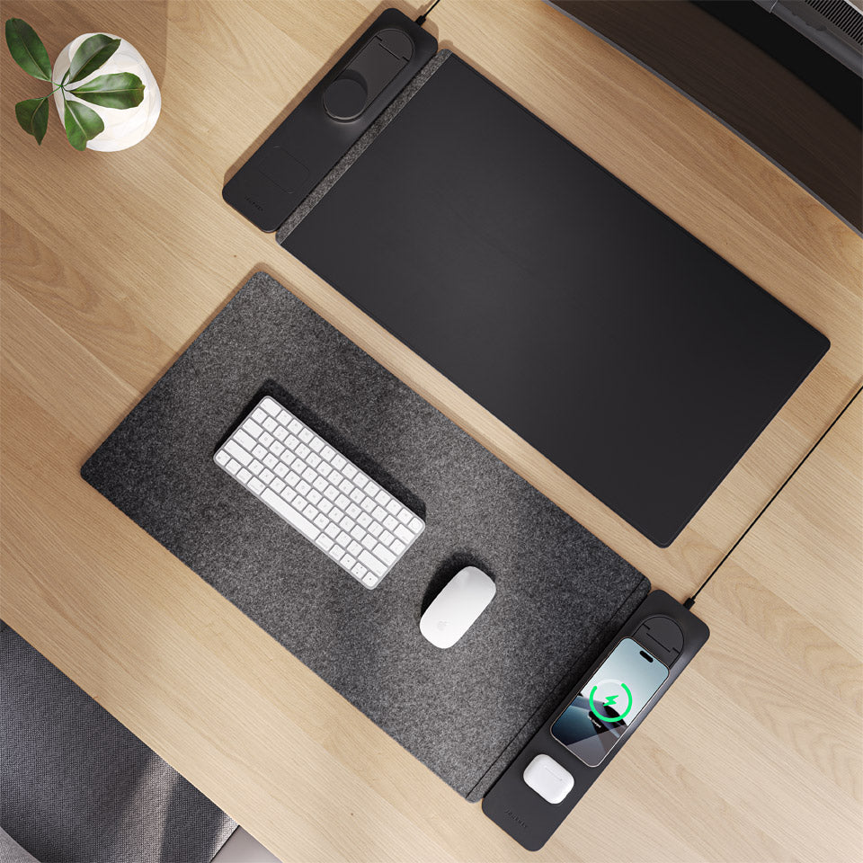 Dedicated space for keyboard/mouse and a magnetic panel that fast-charges phone (adjustable stand) and earbuds.